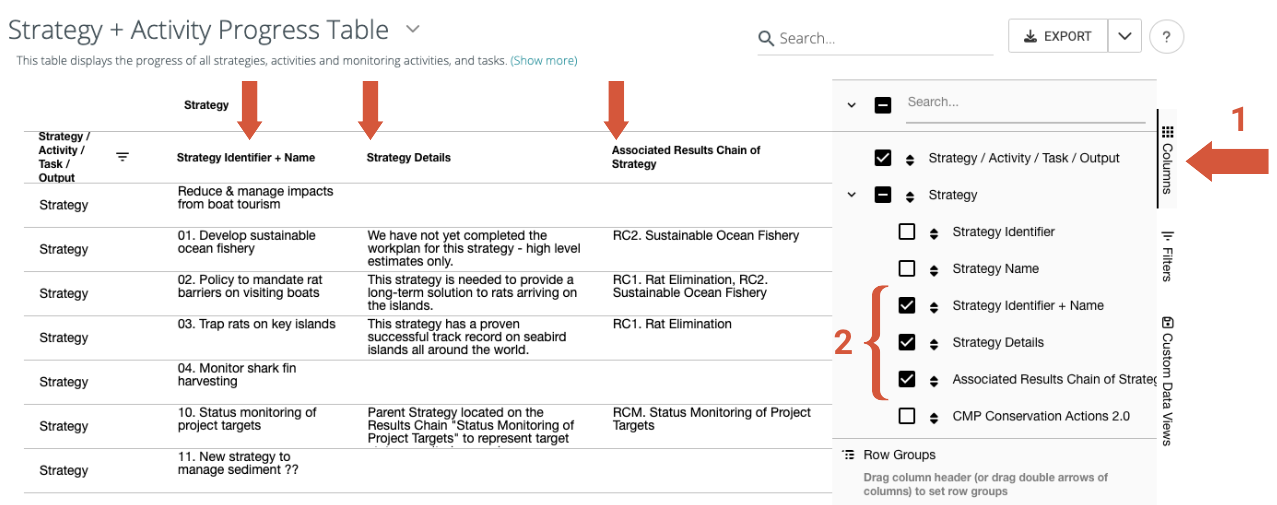 Data Views are powerful tools that allow teams to view Miradi project data in interactive online spreadsheets and export data as .XLS or .CSV files for analysis in other systems (e.g. Excel, Google Sheets, SmartSheet, Access). See more about Using Data Views to Analyze and Export Data in Tables.