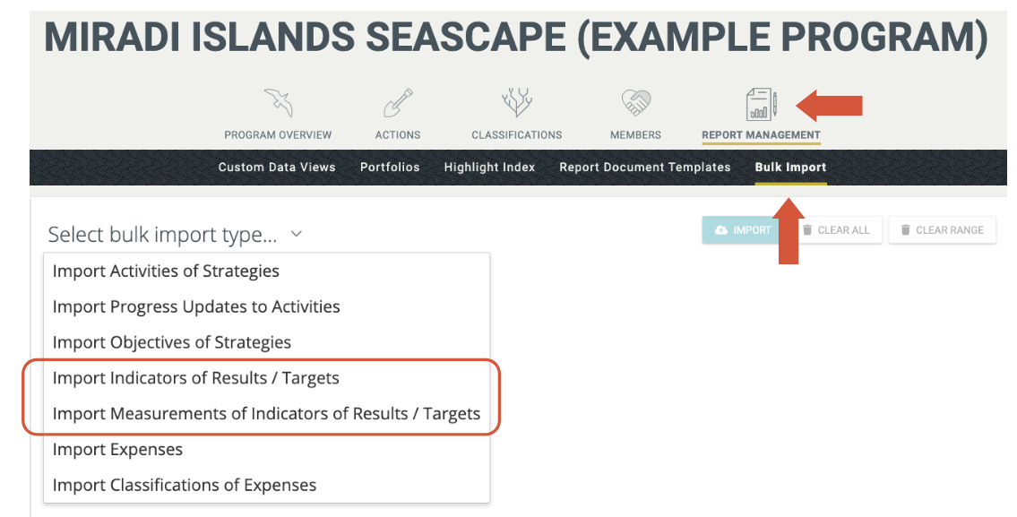 For Miradi users with Program Admin or Program Manager permissions, navigate to the Report Management section and select the Bulk Import page. Use the dropdown menu to identify the type of data you would like to add or edit.