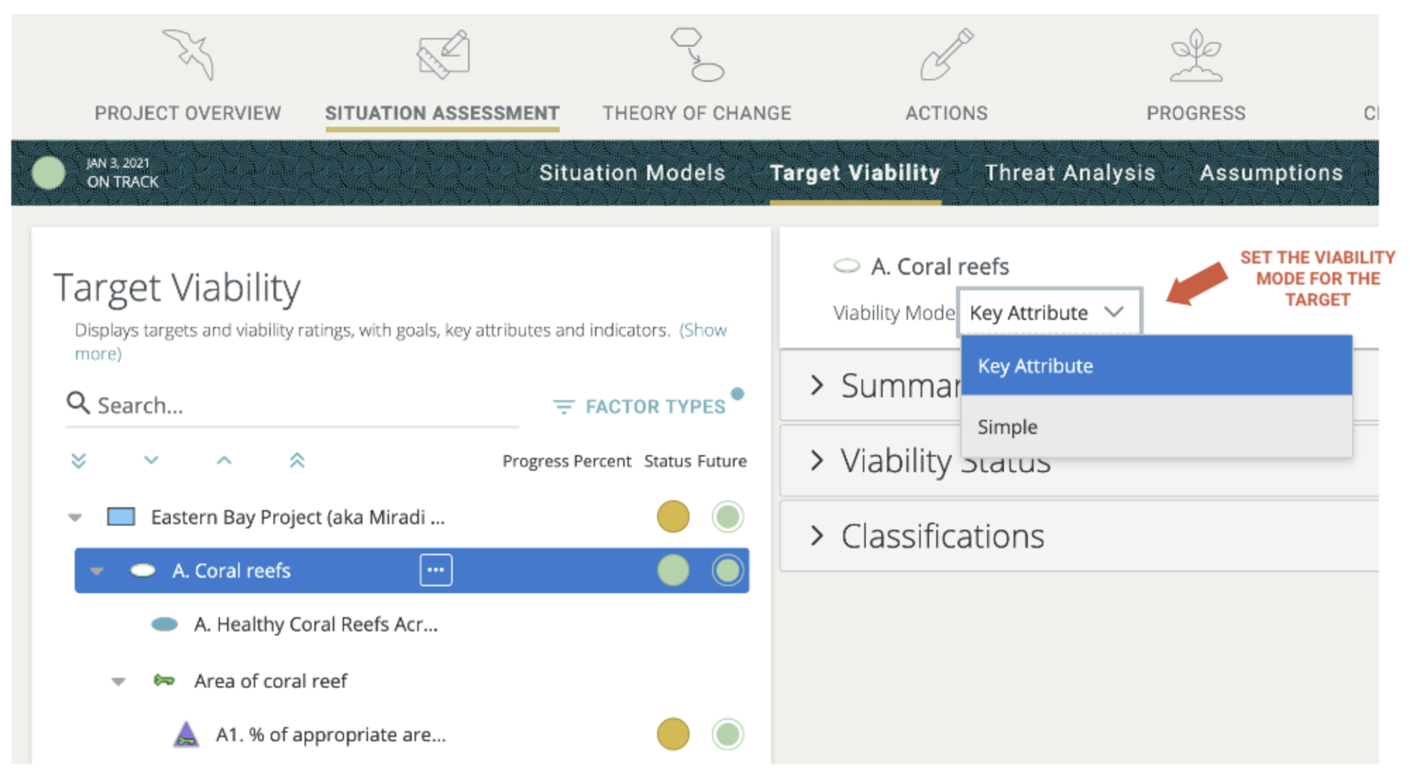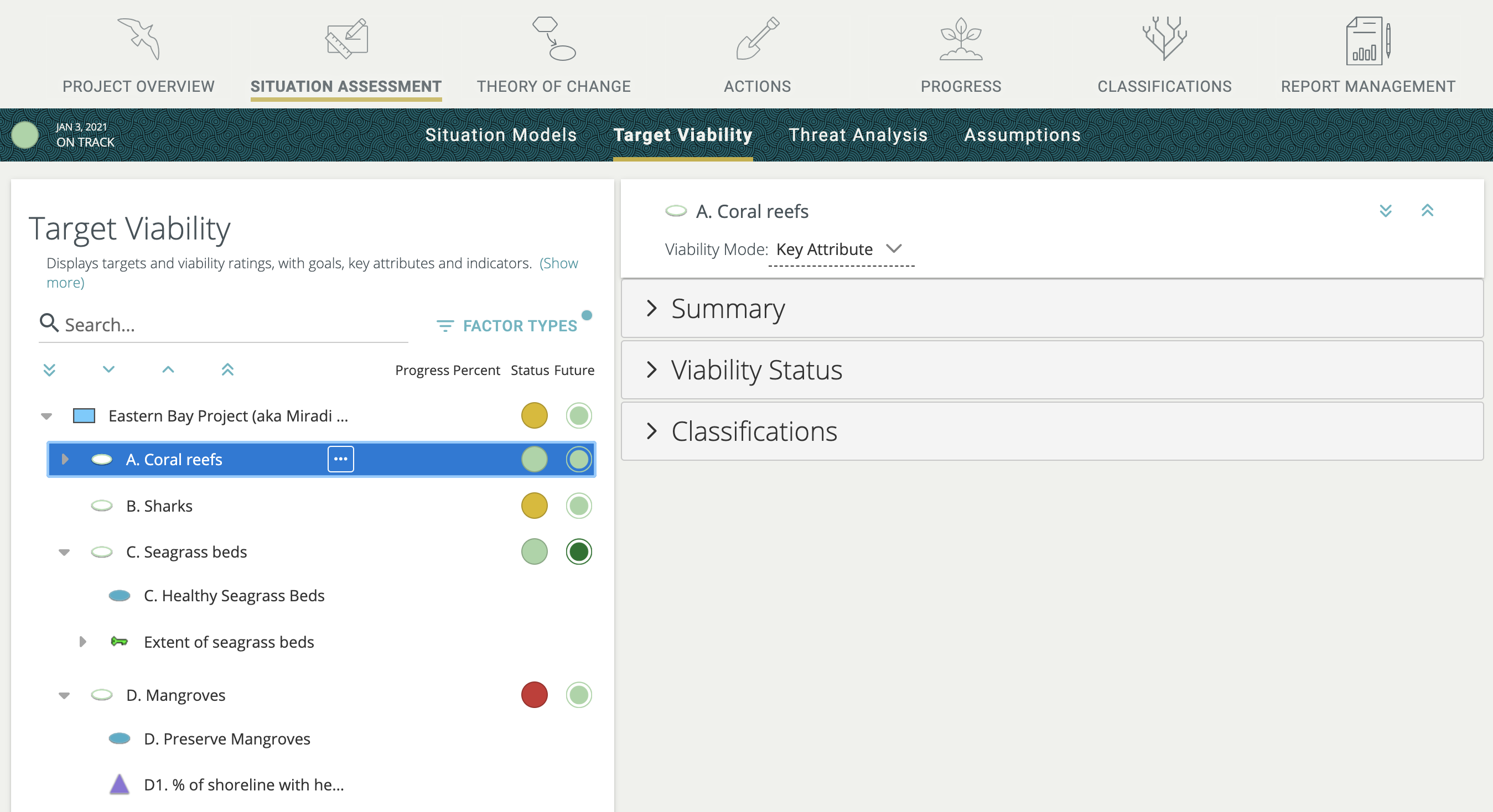 Target Viability and Results Chain content can be viewed in trees rather than diagrams, and now it is even easier to add, delete and re-order content in tree views. Below is an example of the tree view for Target Viability under the Situation Assessment section. The "Coral reefs" target is selected and its properties are shown on the right.