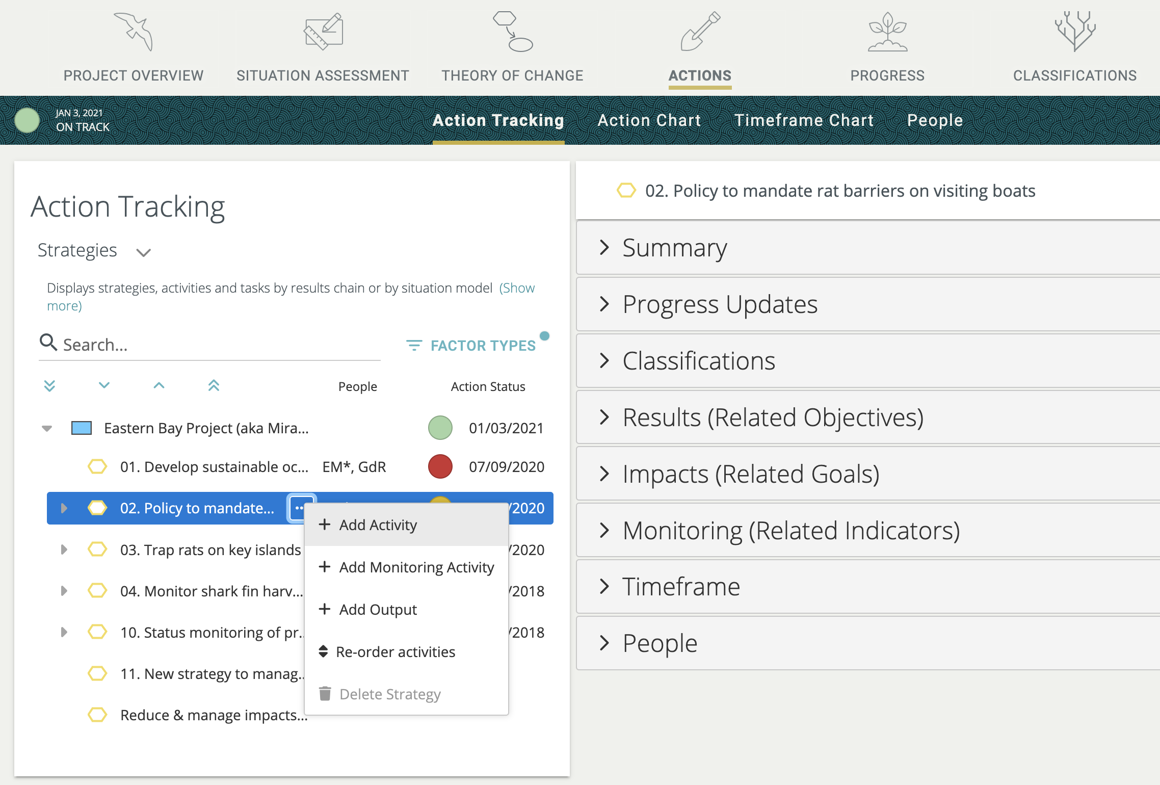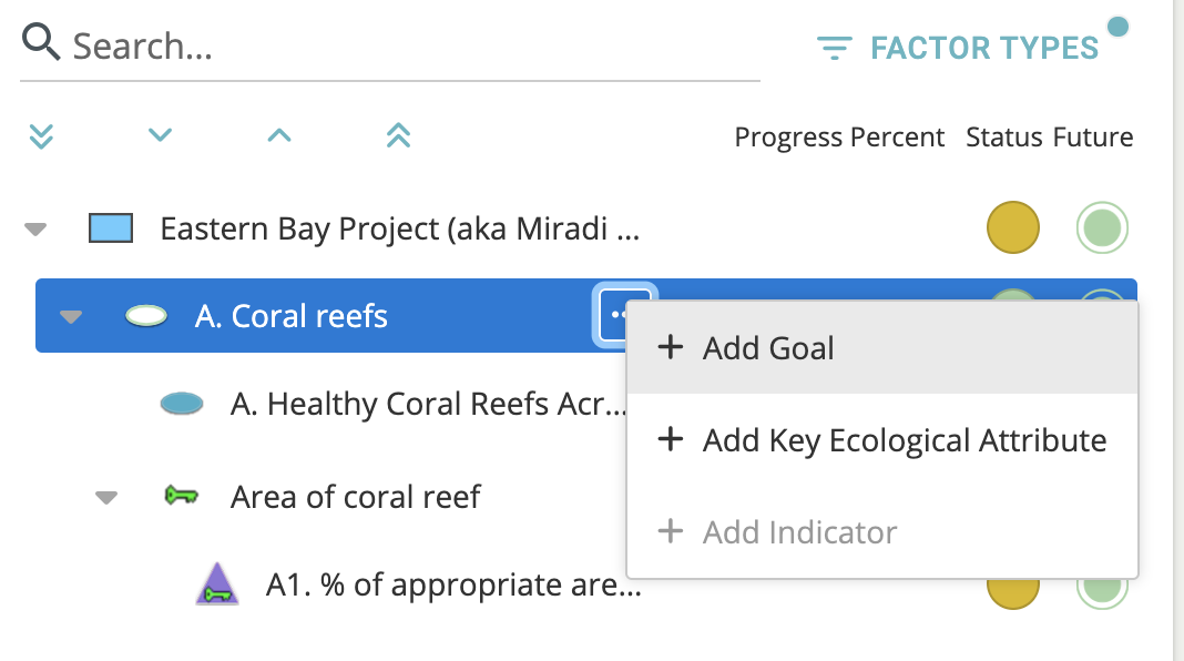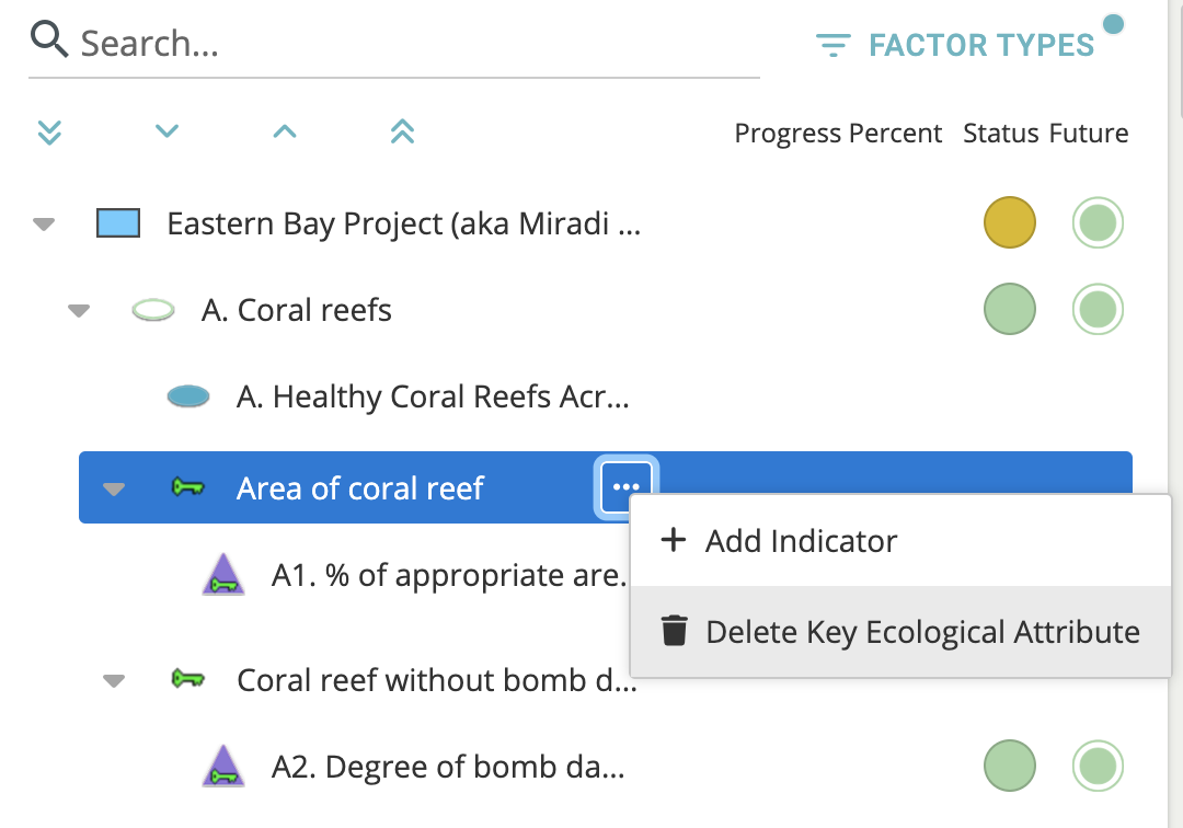When a factor is selected on the left, users are now able to access the "..." menu to delete the factor, add related content, or re-order elements belonging to the factor. In the example below, the "Area of coral reef" Key Ecological Attribute (KEA) is selected; it can be deleted or indicators can be added.