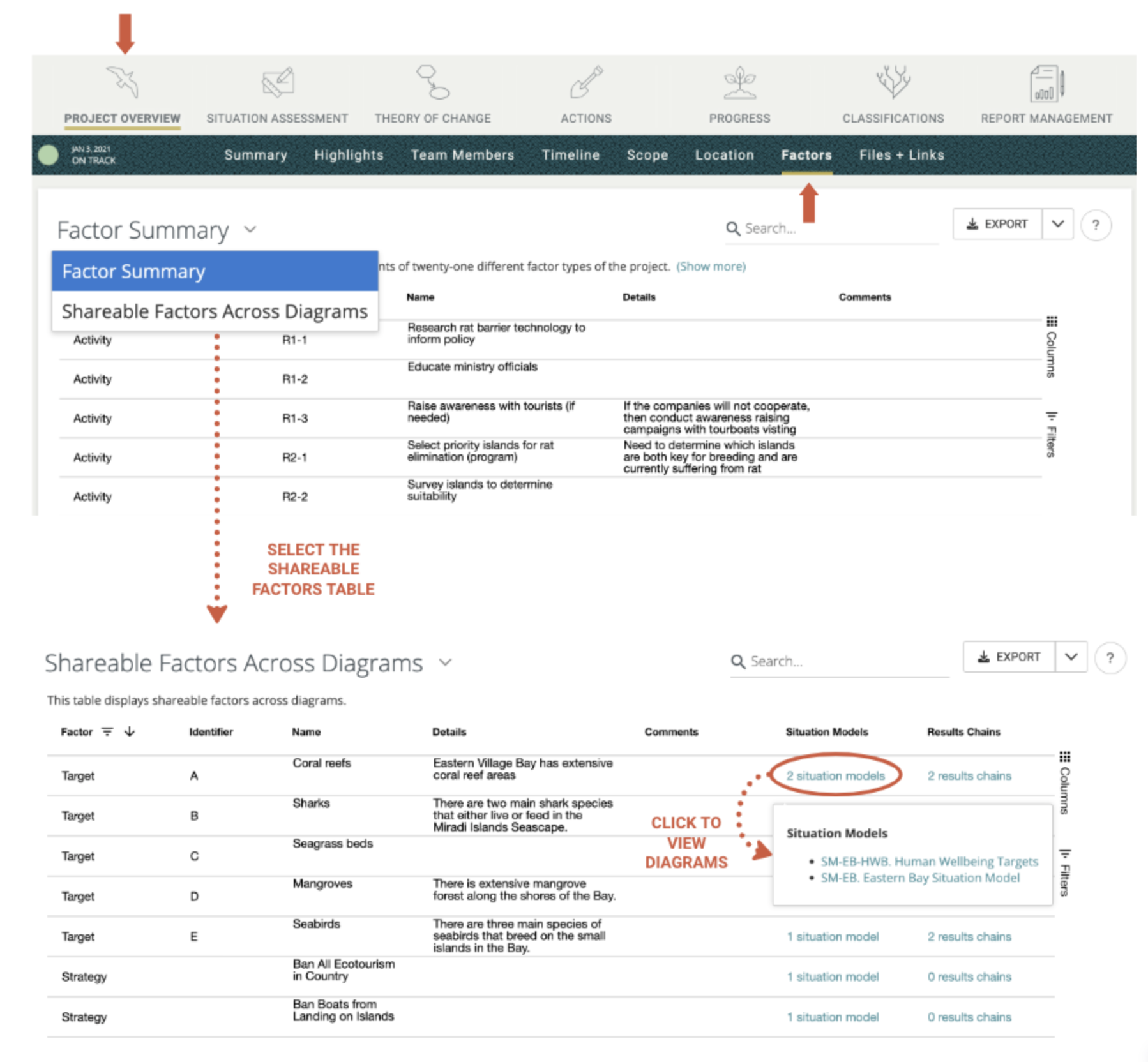A summary of all of the "shareable" factors in your project can now be found on the Factors page under the Project Overview section. Select the "Shareable Factors Across Diagrams" table under the Factor Summary menu. The factors that can be shared are listed on the left, and the diagrams (Situation Models or Results Chains) in which they appear can be seen on the right. Click the name of the diagram to navigate directly to the diagram.