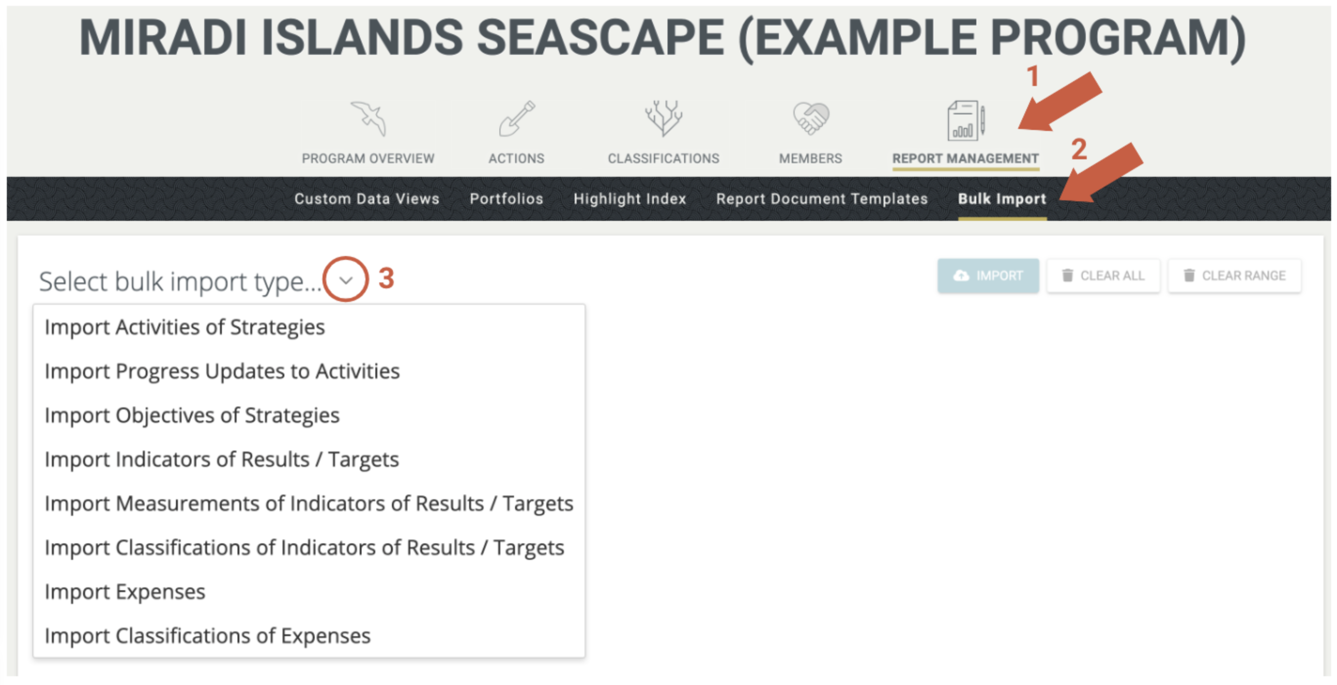Miradi program spaces provide a set of Bulk Import tools to support bulk editing and bulk import of large data sets to one or more Miradi projects at a time. Users with Program Admin level access or higher can access these tools at the program level under Report Management.