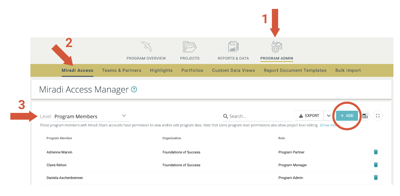 Go to PROGRAM ADMIN and then Miradi Access to add people to the program. In the Miradi Access Manager, set the Level to Program Members, and use the +ADD button to add program members. You can invite an unlimited number of people to collaborate in your program, but everyone needs to have a Personal account in order to be added to the program.