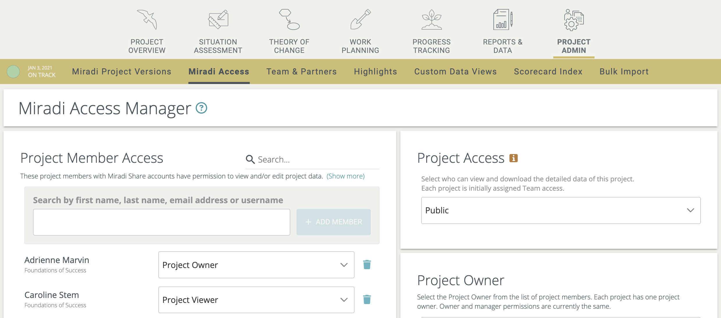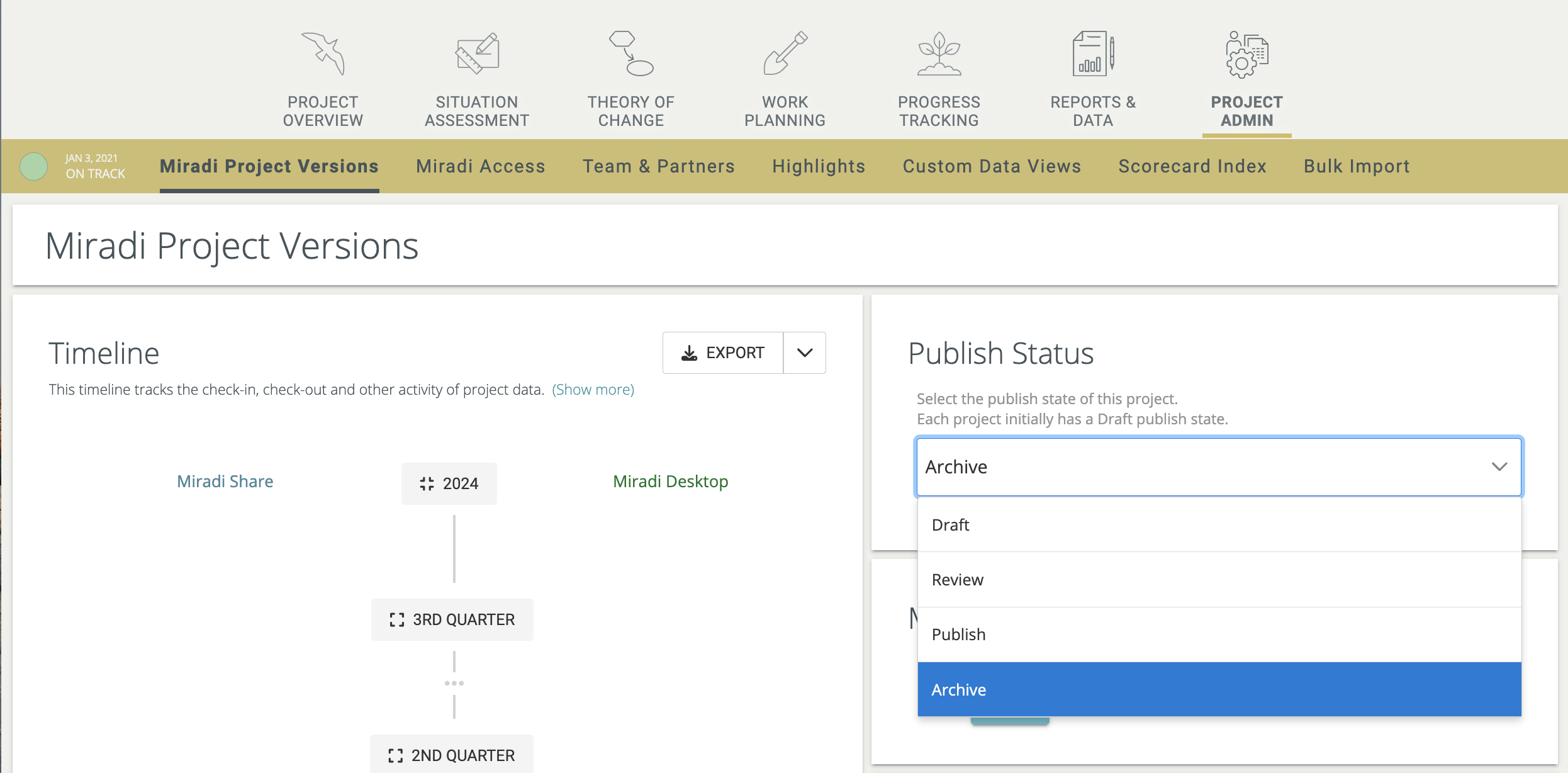 - The project history, versions, and snapshots are not moved to the new program space. We recommend deleting the version of the project in the old space to reduce confusion about which is the active project. However, if you still want access to the old versions, instead of deleting the project you can make all team members "Viewers" only and change the project publication status to "Archive". These changes can be made in the PROJECT ADMIN section under Miradi Project Versions (Publish status = Archive),