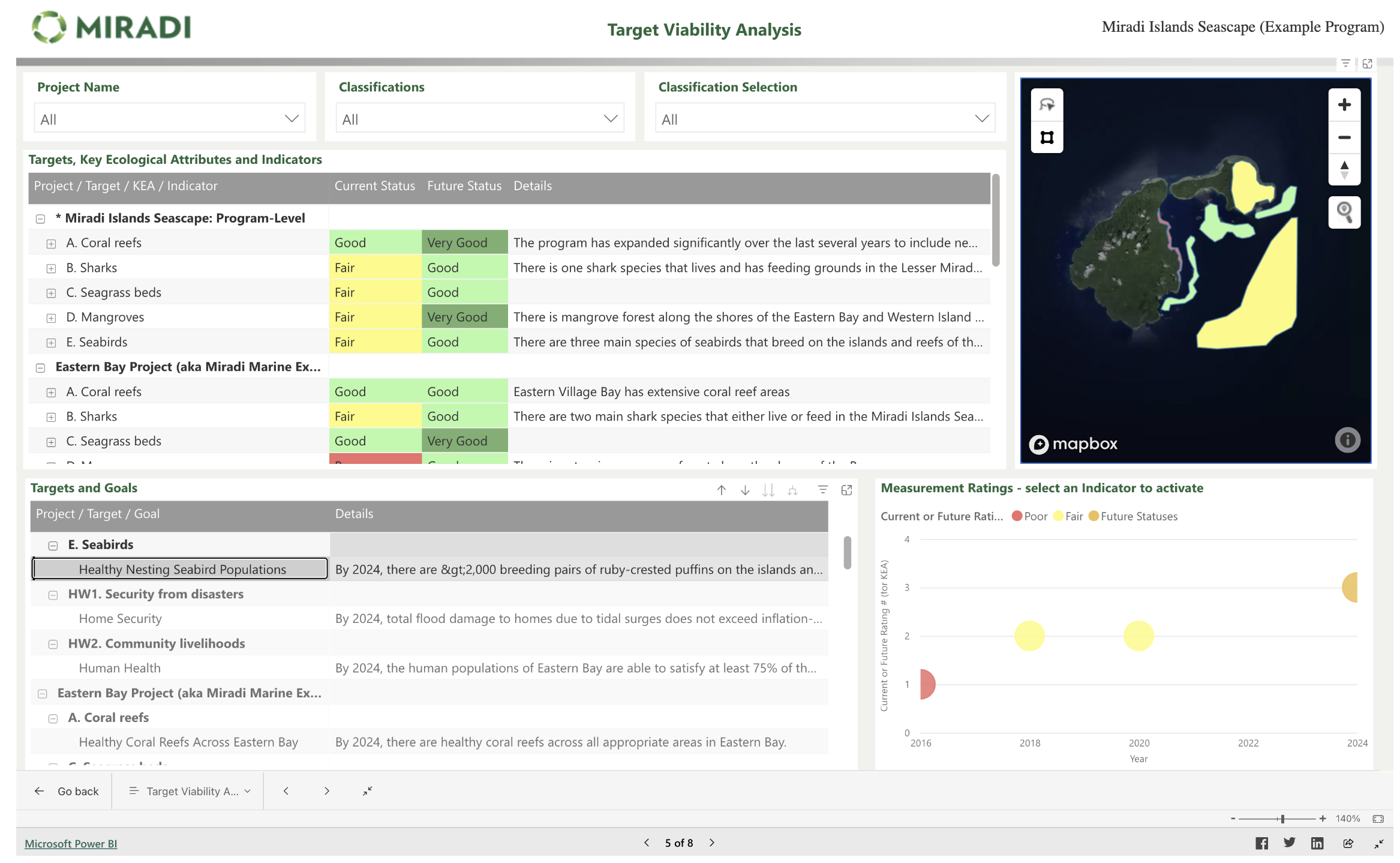 Using Microsoft Power BI, teams can create online, interactive dashboards displaying data from one or more Miradi projects, or combine data from Miradi and other systems. For example, the below Power BI dashboard created by a Miradi user displays Target Viability data from multiple Miradi projects.