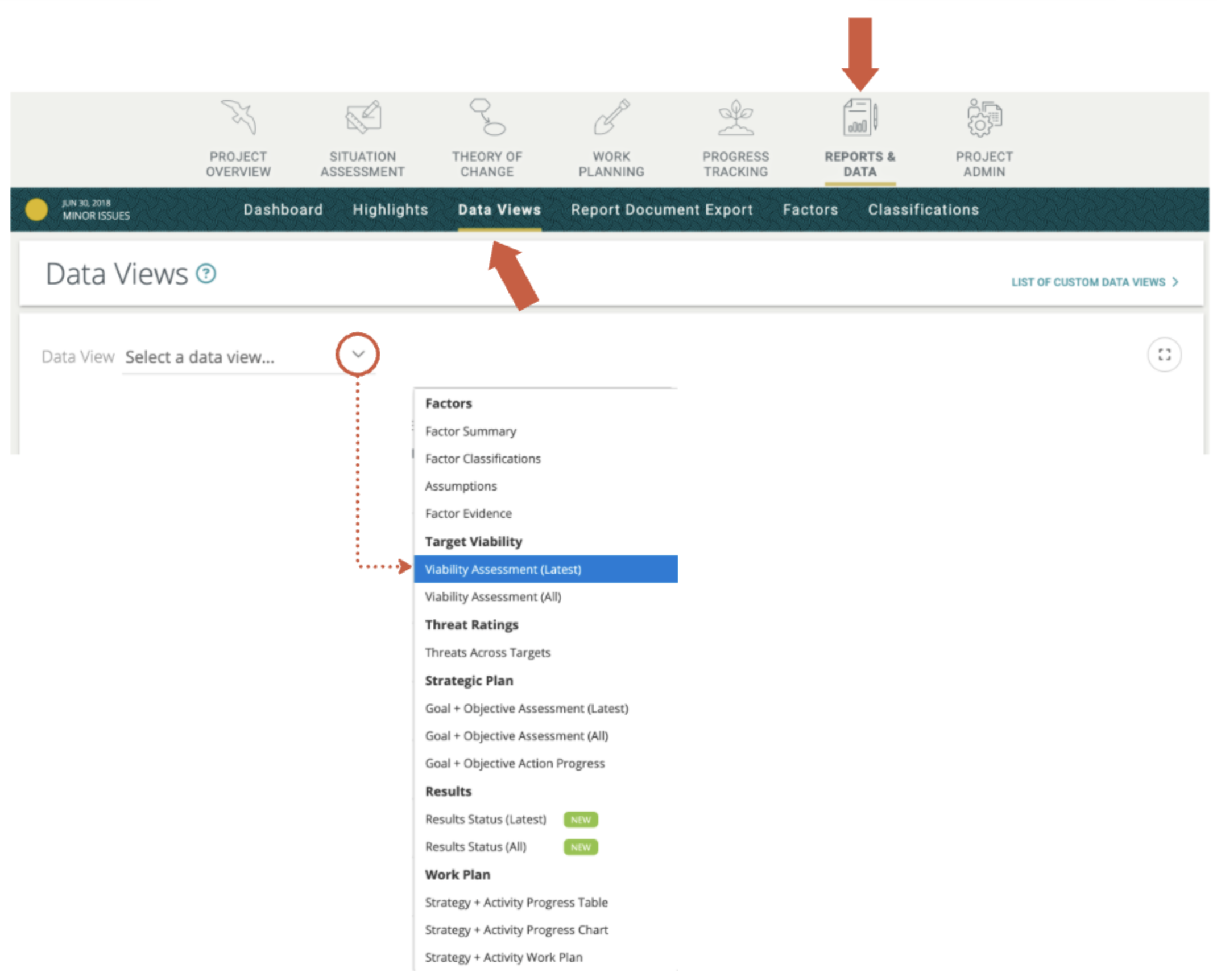 Target Viability information for single Miradi projects can also be viewed and exported under Data Views / Target Viability Assessment (Latest or All). The latest Viability Assessment data for multiple projects in a Miradi program space can be viewed under the program-level Data Views. Learn more about working with Data Views.
