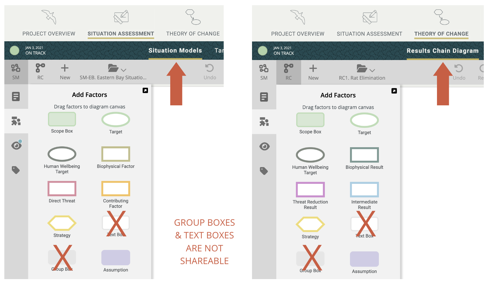 Yep, you are correct that some factors are not shareable. Generally, the factors that you can add directly to Situation Model or Results Chain diagrams can be shared, but the "elements" that belong to those factors can not be shared on their own.