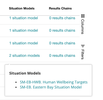 You can find this information in a second table available in the 'Factors' view. Next to the title of the table, use the downward pointing arrow to access the 'Shareable Factors Across Diagrams' table. On the right, you see two columns showing which situation models and results chains the factors appear in.